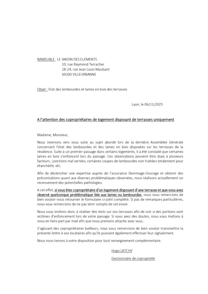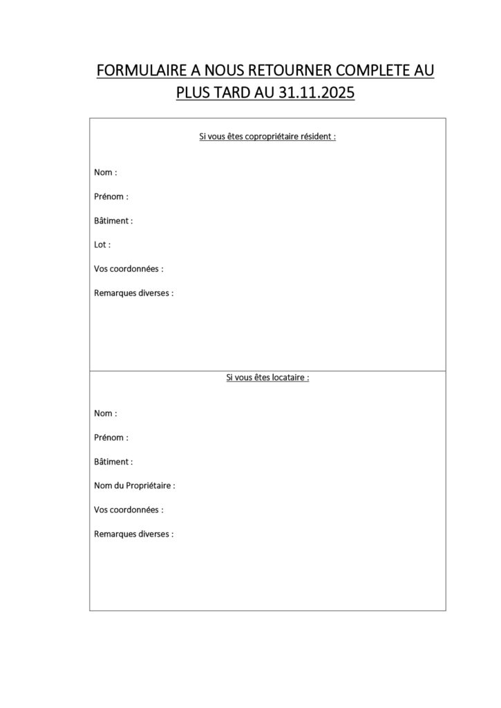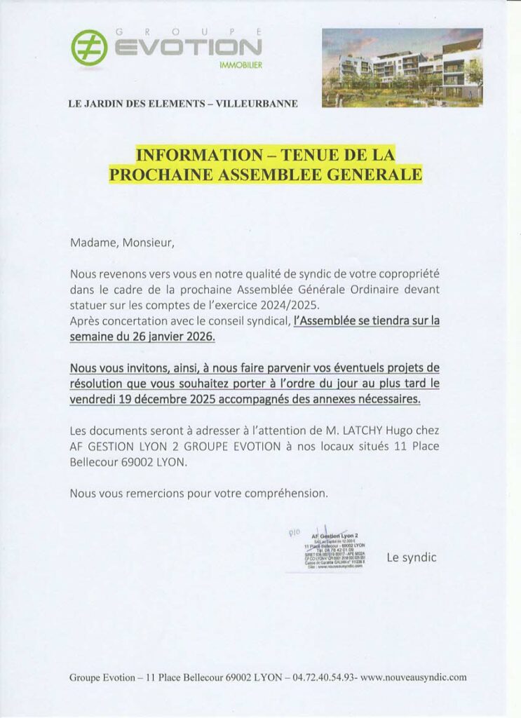 La prochaine AG étant prévue fin janvier 2026, nous sollicitons votre attention sur le fait qu’il manque à ce jour des membres au Conseil Syndical afin d’avoir une personne dédiée à chaque bâtiment.