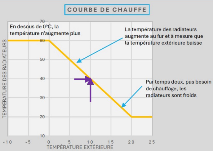 La température de chauffe de la chaudière est ajustée automatiquement en fonction de la courbe suivante :